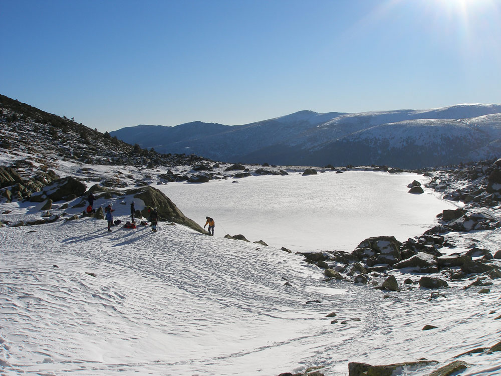 A las 10:15 estábamos a los pies de la Canal de la Ceja con la laguna debajo nuestra. Comimos algo, un poco de agua y a calzarnos los «pinchos» y sacar los piolets.