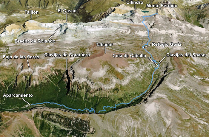 En ese punto iremos, pegados a estas paredes, dirección Este hasta llegar a la gran canal que sube entre el monte perdido y el cilindro. Y empezaremos a ascender por la canal, siempre por la derecha, según subimos.